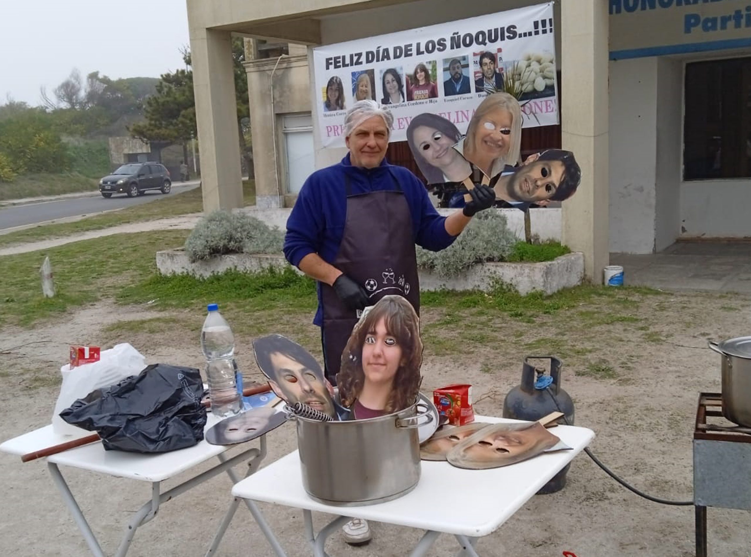Santana, exconcejal y actual referente de Unión y Libertad, organizó una “ñoquiada” frente al edificio legislativo costero, donde cocinó y repartió platos de pasta a los vecinos. Además, entregó caretas con las caras de los ediles como gesto simbólico.