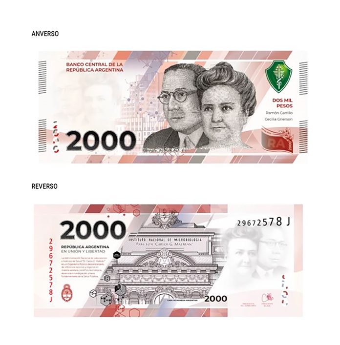 El nuevo billete es un homenaje a la salud. En el anverso tendrá la imagen de Cecilia Grierson, considerada la primera médica argentina, y de Ramón Carrillo, ex ministro de Salud. En el reverso, habrá una imagen de la fachada del Instituto Malbrán.