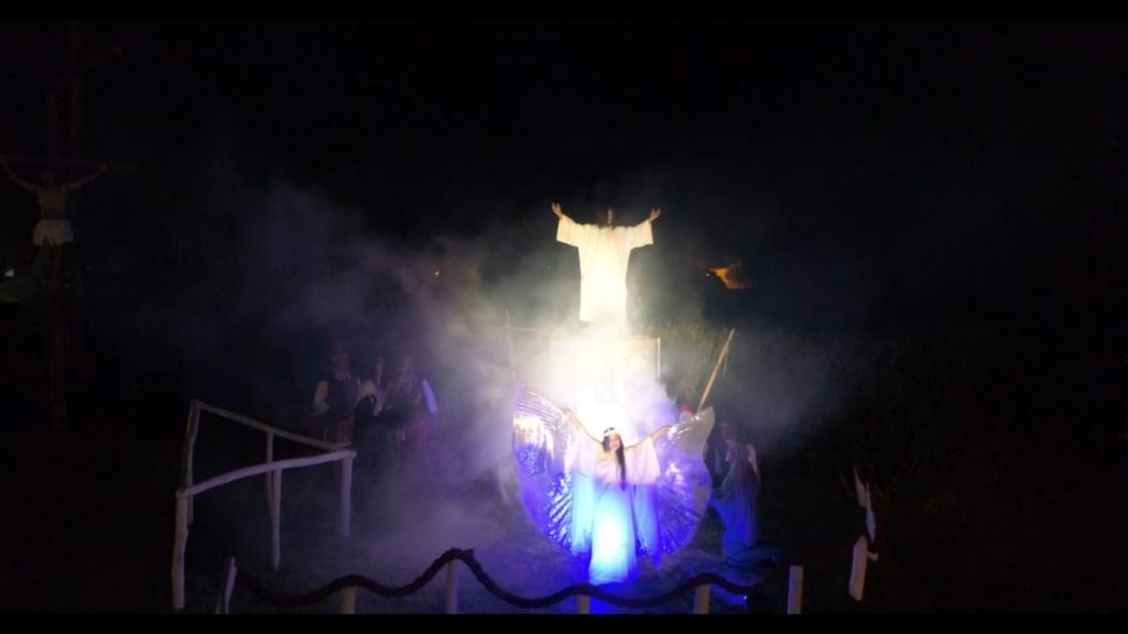 Desde la Capilla San Cayetano continuará la procesión en una caminata acompañada de velas y antorchas hacia el Parque Laberinto de Las Toninas, de Avenida 7 y calle 16, donde se realizará la puesta en escena de las últimas horas de la vida de Jesús de Nazaret, su muerte y su Resurrección. Son 5 escenarios y 120 personas en escena en un espectáculo que ya es un clásico de La Costa.